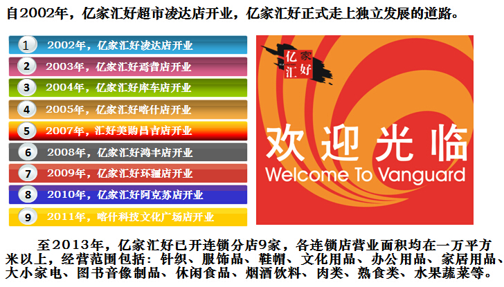 億家匯好商貿有限責任公司于2002年成立,并從臺灣引進連鎖經營職業(yè)管理團隊,統一管理旗下各地的連鎖超市。公司通過多年的穩(wěn)健發(fā)展,至2013年底,億家匯好商貿有限責任公司已成為擁有員工近3000多人,下轄一個配送中心和9家連鎖超市的大型綜合性零售企業(yè)。總經營面積11萬多平方米,配送中心輻射公司所有超市,年配送額可達2億元。公司大量吸納下崗職工,經過崗前培訓,提高勞動技能,實現了他們的再就業(yè),為維護社會和諧穩(wěn)定做出了貢獻。2013年,巴州億家匯好商貿有限責任公司在自治區(qū)零售業(yè)中穩(wěn)踞前三位,是自治區(qū)重要的流通龍頭企業(yè),2013年年銷售收入達10億人民幣。多年來,公司一直重管理、抓實效、運用先進的管理手段和營銷理念,秉承億家匯好人 時時尋求效率創(chuàng)新,事事講究專業(yè)技術的文化精髓,創(chuàng)造了良好的經濟效益和社會效益。公司先后多次被消費者協會評為誠信單位,并多年被評為重合同,守信用單位。